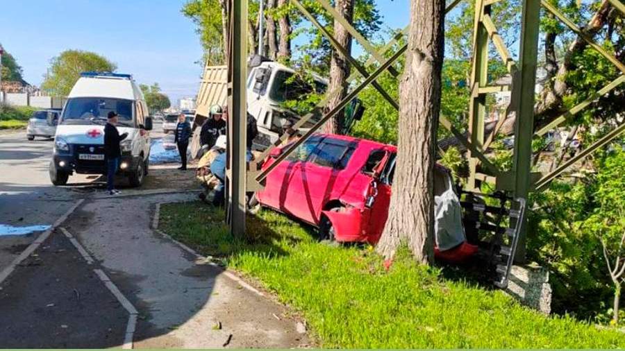 На кадрах видно, что самосвал и минивэн вылетели на обочину. Грузовик врезался в дерево и накренился. У легкового автомобиля серьезные механические повреждения.
