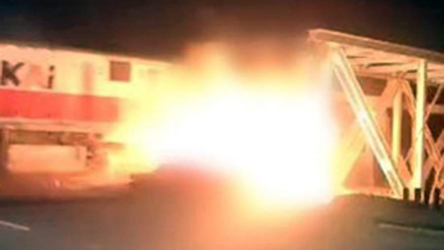 Insider Paper опубликовал видео столкновения. На кадрах видно, что грузовик не успел переехать рельсы, состав ударил фуру прямо в центр прицепа. В результате столкновения грузовик разорвало на две части, одна из которых загорелась.