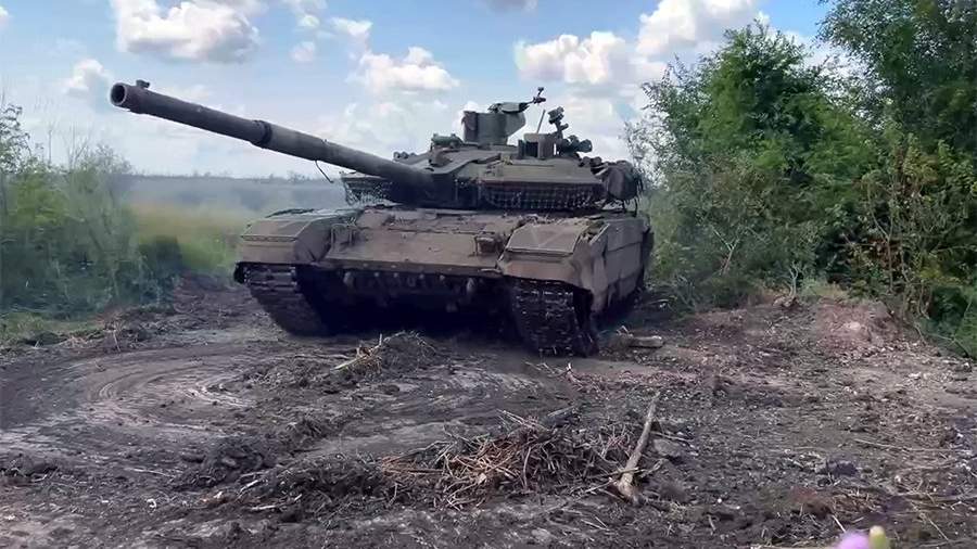 Экипажи танков Т-90М «Прорыв» действуют на передовой, уничтожая вражеские опорные пункты и находящихся там боевиков. Линия разграничения проходит непосредственно перед огневым рубежом, поэтому военные стараются подойти на максимально близкое расстояние и произвести выстрел прямой наводкой.