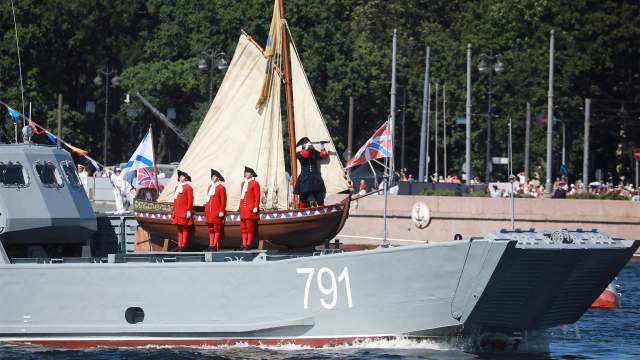 Катер с Владимиром Путиным, министром обороны Сергеем Шойгу и главкомом ВМФ на борту проследовал мимо парадного строя кораблей. Глава государства поздравил экипажи с праздником. Залп салютной батареи Петропавловской крепости дал сигнал к началу празднования.