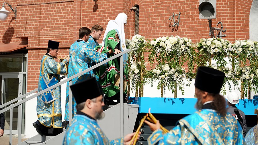 Патриарх Кирилл в понедельник, 28 августа, освятил воссозданную икону Спаса Нерукотворного, находящуюся на внутренней стороне Спасской башни Кремля в Москве.