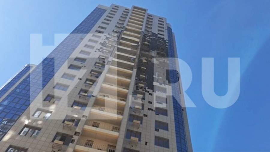 На записи видно, что фасад жилой многоэтажки поврежден в районе нескольких этажей. Там же можно увидеть искореженный металлический осколок. На кадрах заметно, что тротуар у попавшего под обстрел дома усыпан осколками.