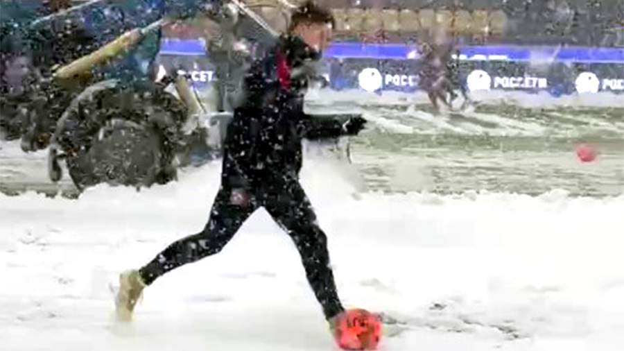 На кадрах видно, как спецтехника сгребает снег со стадиона «ВЭБ Арена» в Москве, пока рядом разминаются игроки команд.