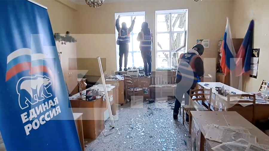 На кадрах видны следы от пожара и осколков на фасаде, а также разбитые стекла окон. В момент обстрела в здании велся прием граждан у главы администрации района.
