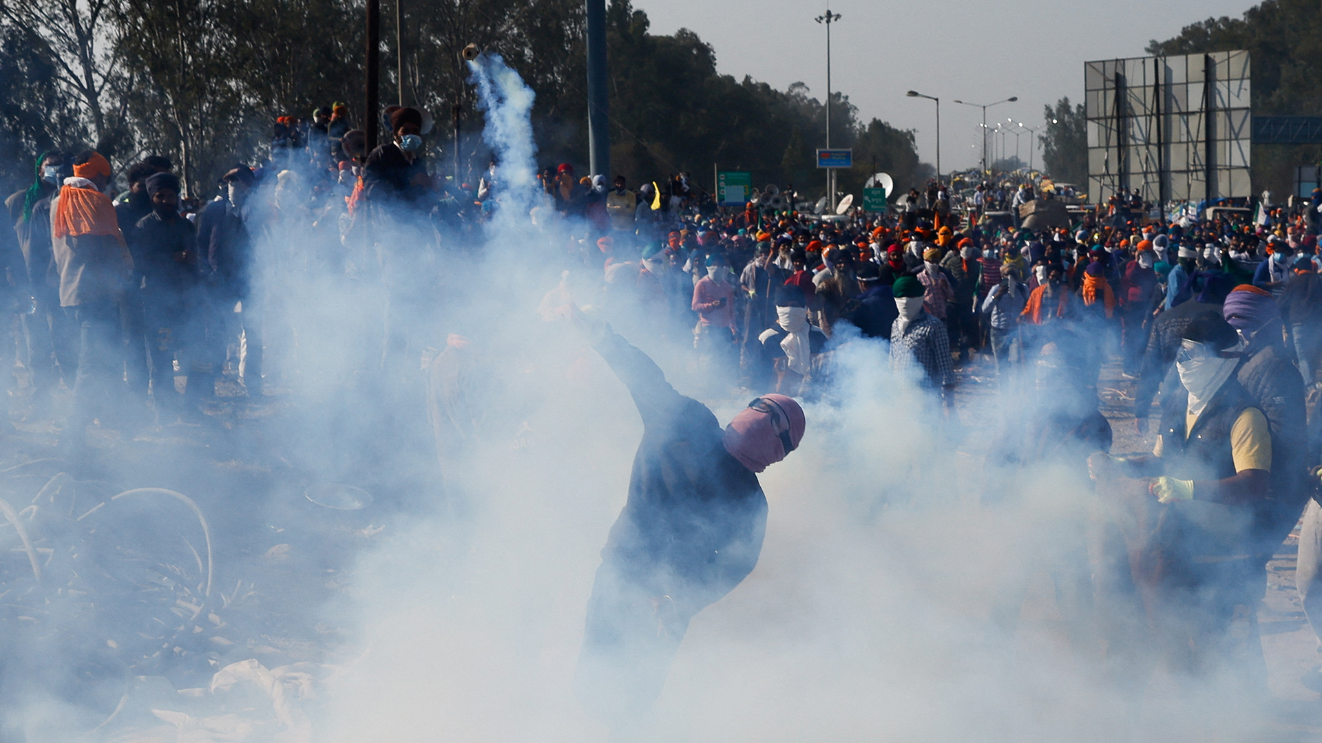 Накануне на подъездах к столице, на границе штатов Харьяна и Пенджаб, фермеры вступили в стычки с полицией, пытаясь прорваться через баррикады. Правоохранители применили против демонстрантов водометы и слезоточивый газ. Некоторые фермеры утверждали, что на территории Пенджаба снаряды с газом на них сбрасывали с беспилотников, отправленных из Харьяны. В свою очередь, полиция штата заявила, что это было ответной реакцией на действия протестующих, которые начали забрасывать ее сотрудников камнями. По официальной информации, 24 полицейских получили ранения. Со стороны участников шествия, по словам лидеров протестов, пострадали более 60 человек. Тем не менее они заявили, что продолжат марш к столице.