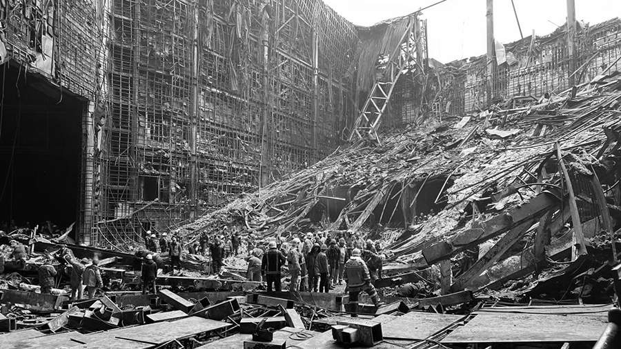 По его словам, под самими конструкциями могут находиться тела погибших. На кадрах видно место, где террористы раскидывали гранаты, после чего и произошел пожар. Также можно увидеть черные обугленные конструкции, где мог располагаться очаг возгорания.