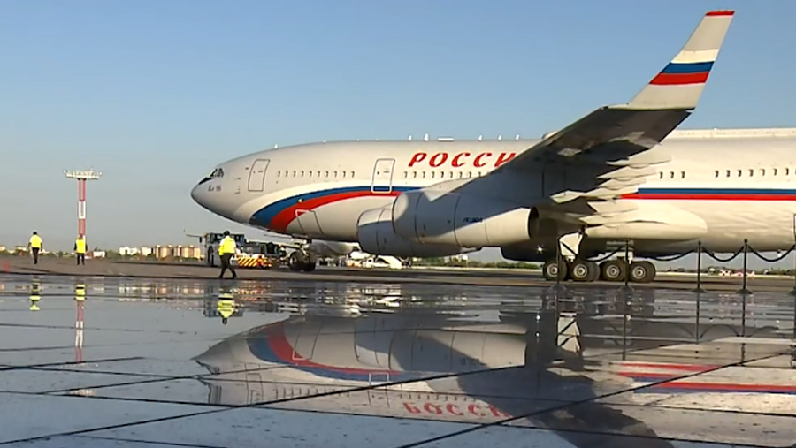 На кадрах видно, как российский лидер прощается с президентом Узбекистана Шавкатом Мирзиёевым и поднимается на борт самолета.