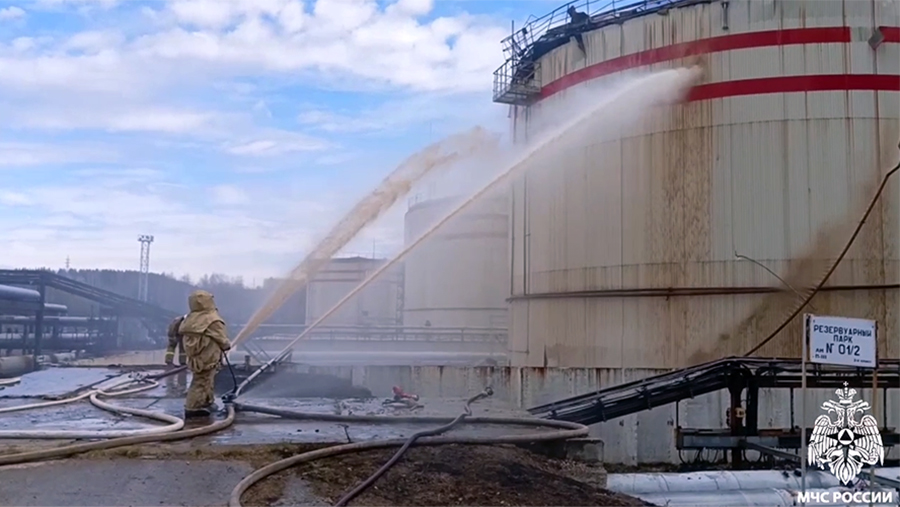 Уточняется, что предприятие находится в 4 км от города. Возгорание произошло в резервуаре РВС-10000. Пожар тушат 74 спасателя при поддержке 22 единиц спецтехники.