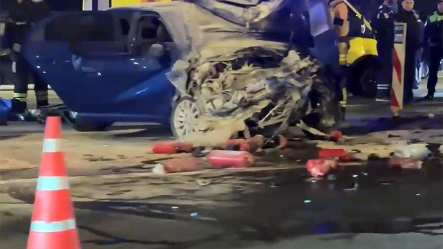 На кадрах видно, что удар был такой силы, что машины смяло. Проезжая часть усыпана фрагментами автомобилей.