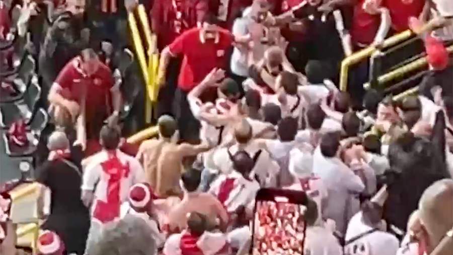 На кадрах видно, как между несколькими десятками фанатов завязалась потасовка, они бросали друг в друга подручные средства. При этом все болельщики остались на своих секторах. Отмечается, что вскоре фанатов разняли полицейские.