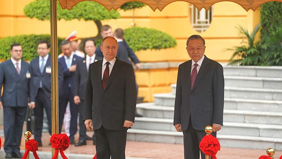Утром глава государства приехал к президентскому дворцу в столице Вьетнама, там его встретили с почетным караулом и военным оркестром, сыгравшим гимн РФ. После этой церемонии Путин и То Лам начали переговоры.