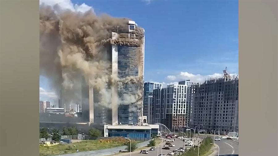 Небоскреб расположен на проспекте Туран 37/9. На 26-м этаже горит наружная обшивка здания.