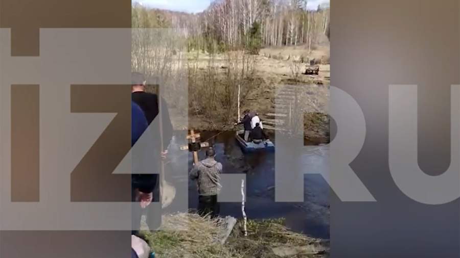 На кадрах показано, как жители переправляют на лодке гроб, крест и венки. Рядом с переправой есть самодельный мост, сложенный из досок. На видео также запечатлен момент, как в прицепе мотороллера везут гроб.