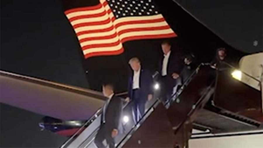 На кадрах, появившихся в Сети, видно, как Трамп спускается по трапу самолета и машет рукой журналистам. Бывшего главу Белого дома при этом сопровождают личная охрана и сотрудник Секретной службы.