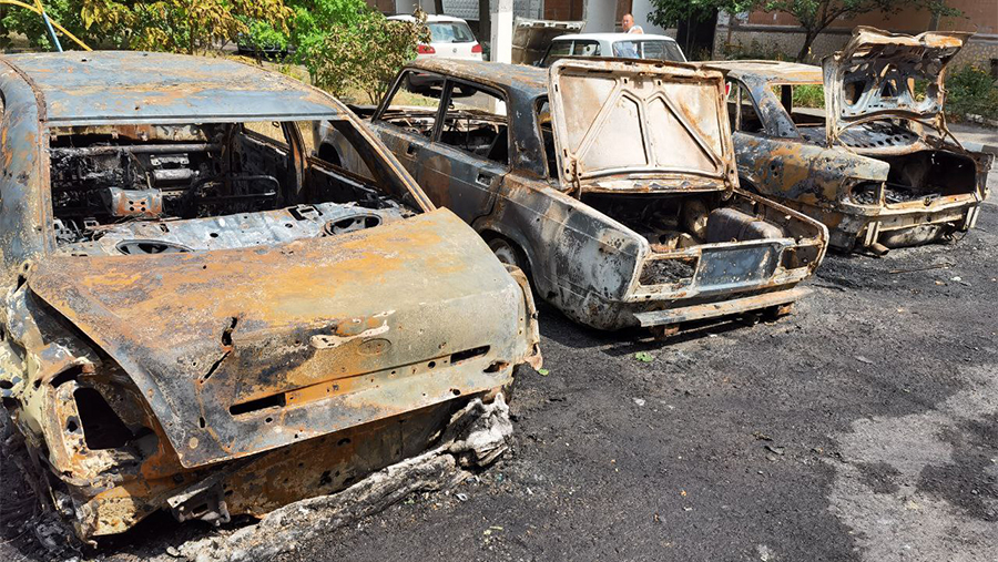 «Известия» показали последствия обстрела. Один из ударов пришелся на детскую площадку. В близстоящем жилом доме были разбиты окна, посечен фасад. В результате удара повреждения получили и автомобили.