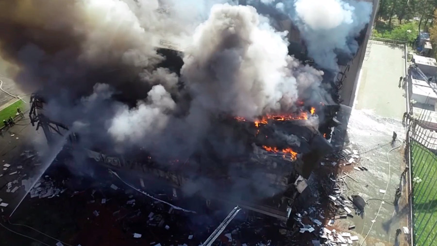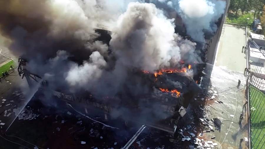 Позже в МЧС рассказали, что площадь увеличилась до 4 тыс. кв. м. При тушении произошел взрыв четырех баллонов с газом. Пожар тушат более 50 специалистов и 11 единиц техники. В результате пожара одну женщину госпитализировали, еще двум мужчинам медицинскую помощь оказали на месте.