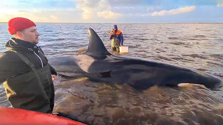 Ранее в этот день сообщалось, что косаткам удалось выйти в открытое море. Однако чуть позже очевидцы опубликовали видео, на котором видно, что одно из животных застряло на мели. По словам местных жителей, она задыхается и лежит перевернутой в воде. На помощь животным направились восемь сотрудников ведомства.
