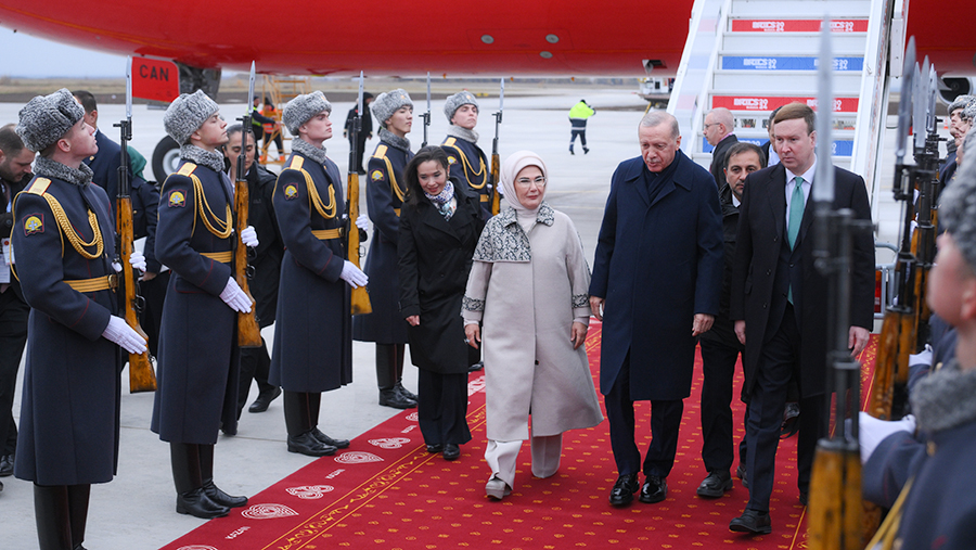 В аэропорту его с женой Эмине встретил глава Татарстана Рустам Минниханов, который вручил супруге президента Турции букет цветов. У трапа их также угостили караваем и чак-чаком.