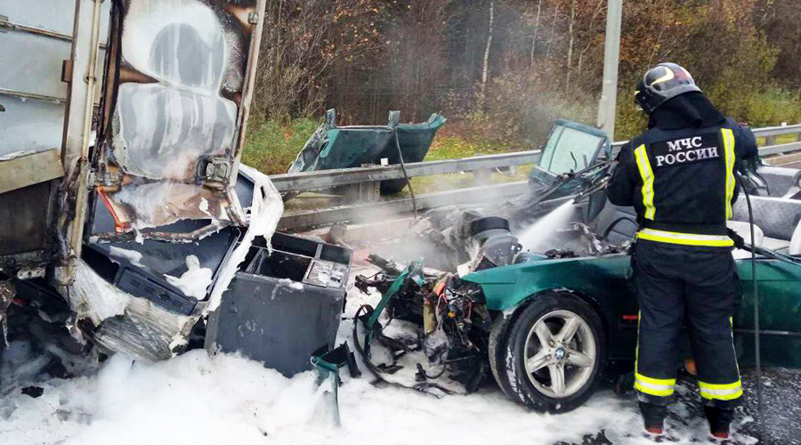 В данный момент выясняются обстоятельства произошедшего. На месте аварии работают спасатели. Они потушили возгорание на 4 кв. м и деблокировали пострадавшего, находившегося в легковом авто.