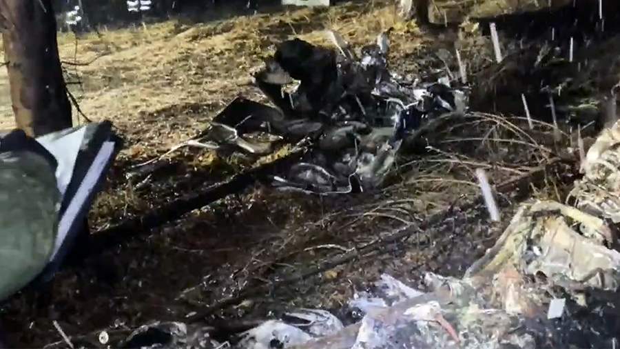 На кадрах видно, что фюзеляж разбившегося вертолета сильно обгорел. Оставшиеся части потерпевшего крушение вертолета тлеют.