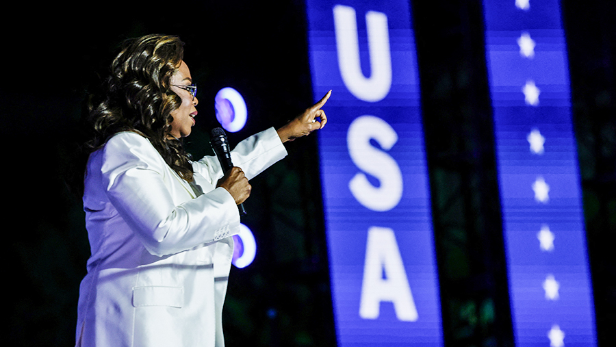 В сентябре телеведущая организовала мероприятие в поддержку кандидата от демократов, на которой присутствовали актеры Мэрил Стрип, Крис Рок, Джулия Робертс и другие. В связи с этим в американских СМИ распространилась информация о том, что для этого штаб Харрис выплатил Уинфри $1 млн.