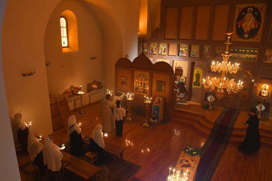 Ночная служба (всенощное бдение) в православном старообрядческом храме во имя Сретения Владимирской чудотворной иконы Пресвятой Богородицы в Красноярске