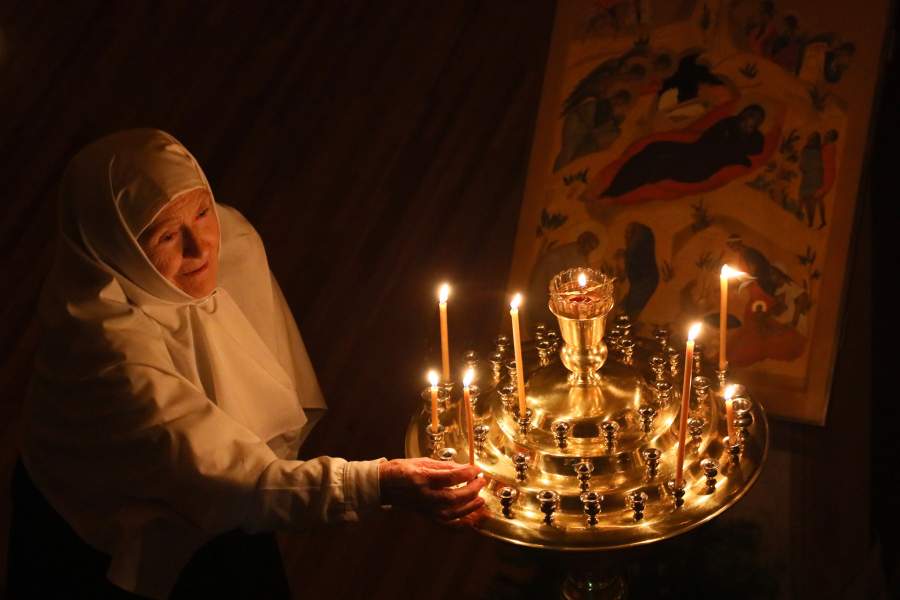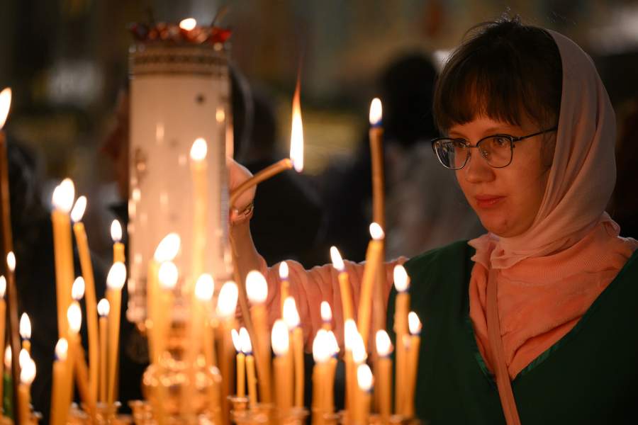 Женщина ставит свечку в Вознесенском кафедральном соборе Новосибирска
