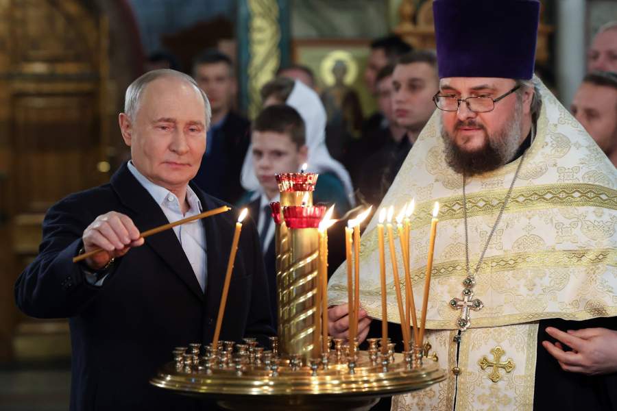 Президент РФ Владимир Путин во время рождественского богослужения в храме великомученника Георгия Победоносца на Поклонной горе