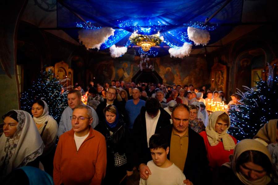 Верующие и священнослужители во время вечерней рождественской службы в храме во имя Сретения Владимирской чудотворной иконы Пресвятой Богородицы Русской православной старообрядческой церкви в Красноярске