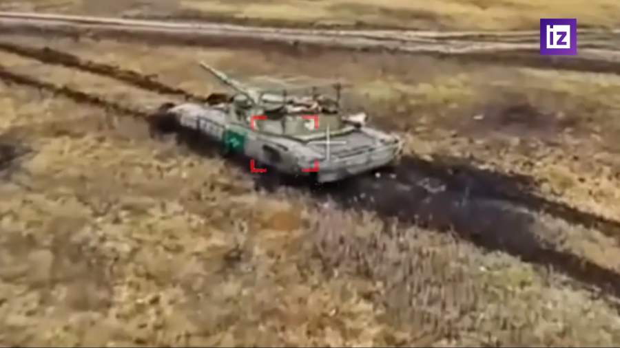 Кадры объективного контроля уничтожения танка Т-64 ВСУ расчетами FPV-дронов группировки войск «Запад» в зоне проведения СВО в ДНР