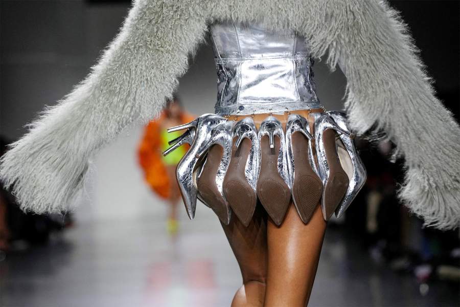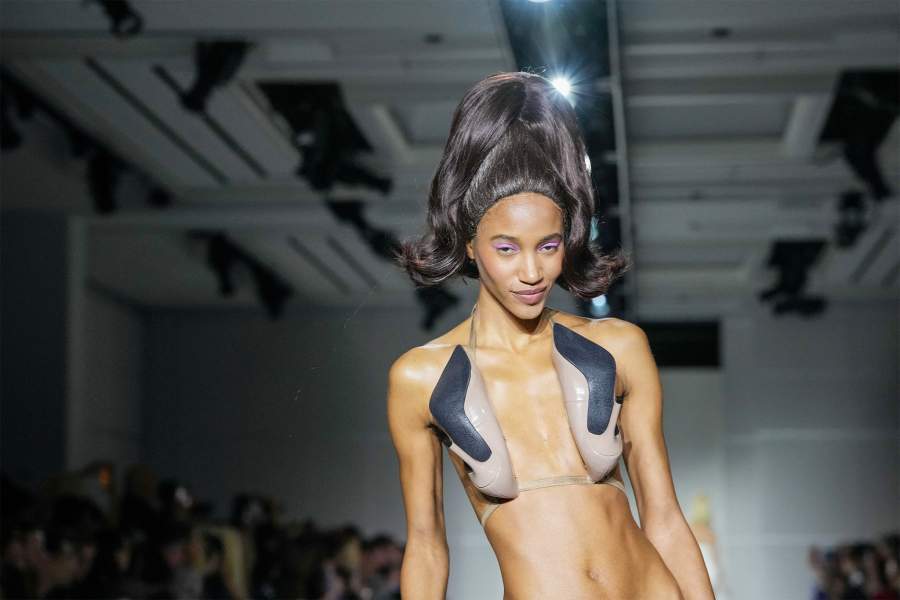 Модель на подиуме во время показа Кристиана Коуэна