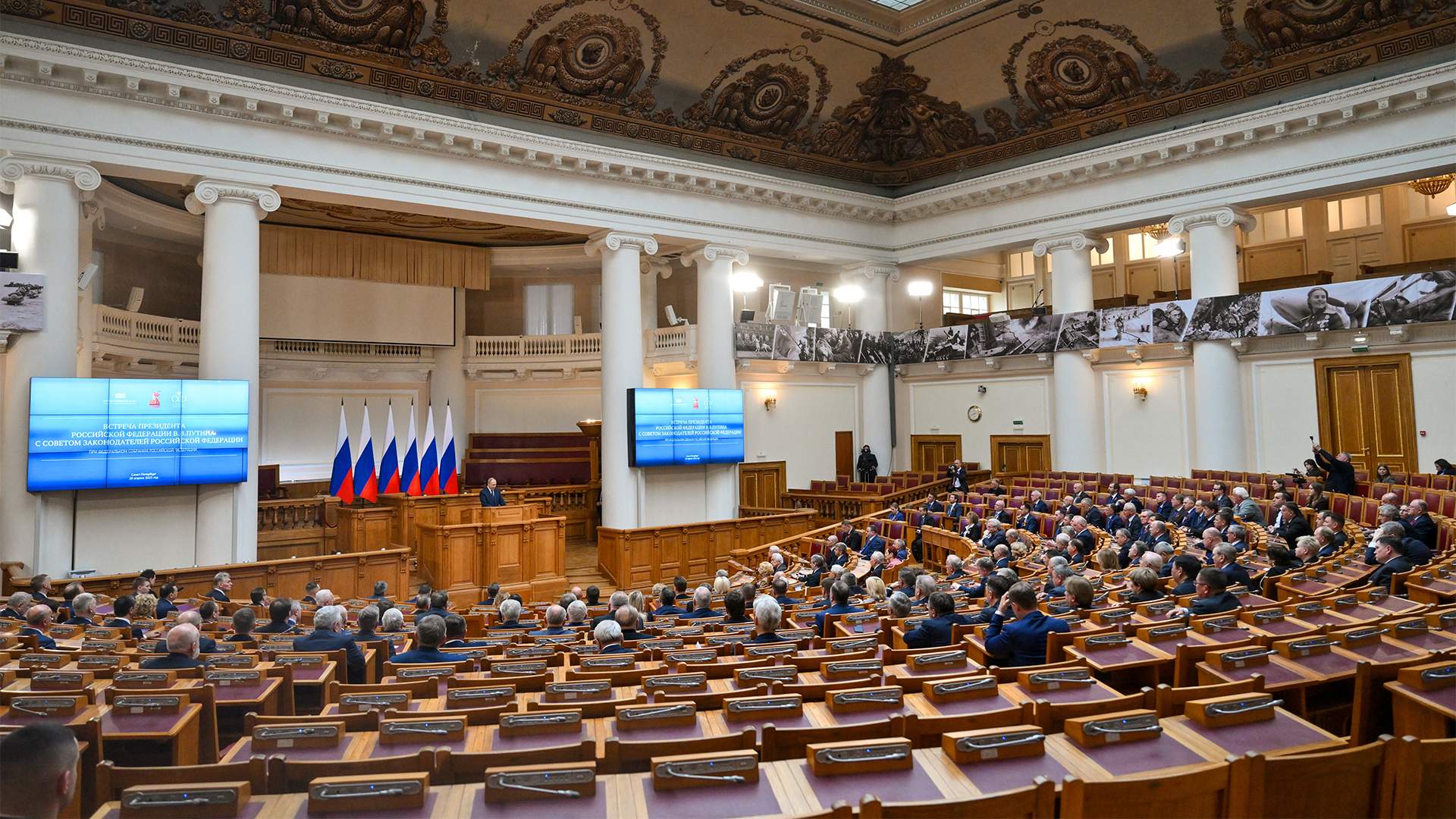 Владимир Путин 28 апреля приехал в Санкт-Петербург на заседание Совета законодателей — оно по традиции прошло в Таврическом дворце. Место выбрано не случайно: в 1905 году решением Николая II дворец стал местом работы первого российского парламента — Государственной думы. Время проведения нынешней встречи обусловлено Днем парламентаризма, который в РФ отмечается 27 апреля.