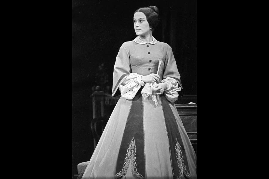 Валентина Талызина родилась в Омске в 1935 году. В 1952 году поступила на экономический факультет Омского сельскохозяйственного института, но изучала основы экономики всего два года — в 1954-м отправилась в Москву, где с первой же попытки поступила в Государственный институт театрального искусства имени Анатолия Луначарского (ГИТИС). В 1958 году вместе с Вадимом Бероевым, своим однокурсником, получила приглашение на работу в Театр имени Моссовета. На фото — Валентина Талызина (Мадам Н) и Вадим Бероев (Антуан) в сцене из спектакля «Жизнь Сент-Экзюпери». Государственный академический театр имени Моссовета. 1968 год