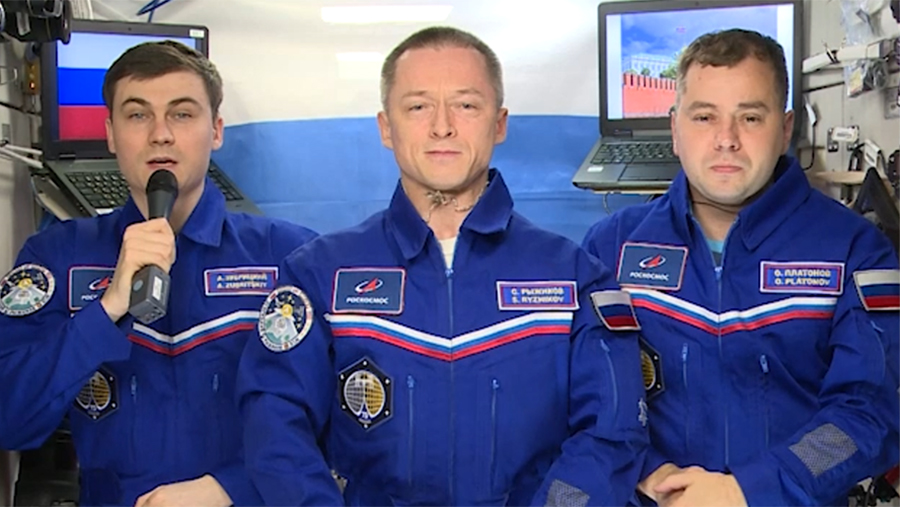 Завершили свое поздравление космонавты совместным посланием: «С праздником!»