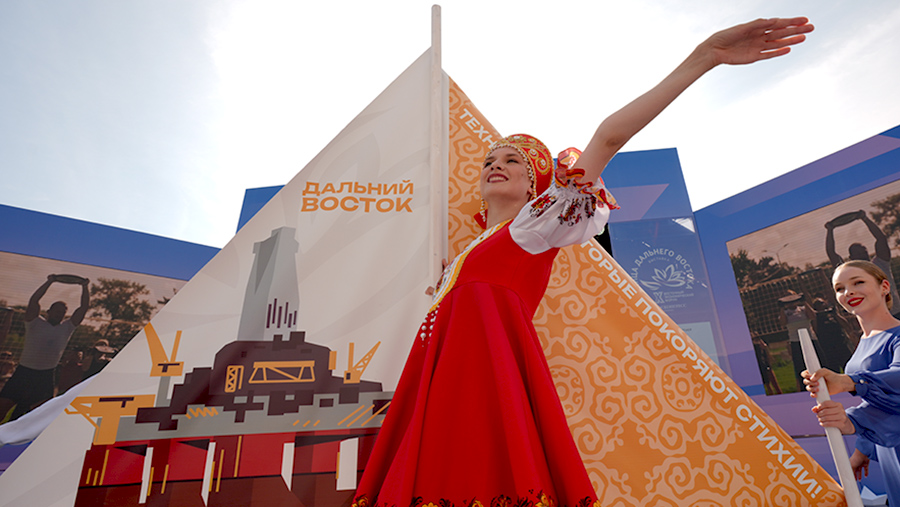 В рамках открытия «Улицы Дальнего Востока» и празднования Дня победы над милитаристской Японией состоялось торжественное шествие с большой георгиевской лентой по набережной ДВФУ до главной сцены выставки. Также под аккомпанемент эстрадного оркестра МГУ им. Г.И. Невельского почетный караул Тихоокеанского высшего военно-морского училища им. С.О. Макарова внес на площадку флаг Российской Федерации и Знамя Победы.