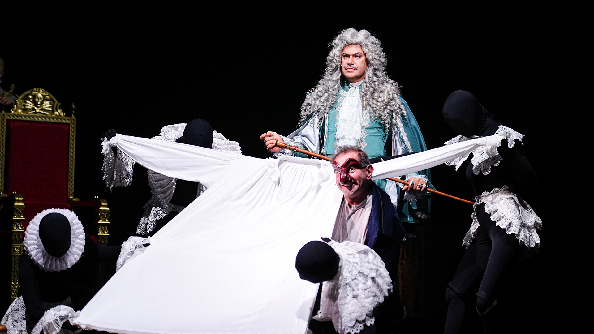 Ожидания зрителей, готовых к хрестоматийной пьесе Булгакова, были не до конца оправданы. На сцене — качели. В центре — две гигантских головы. Позади — стеллаж, на полках которого жуткие пупсы, напоминающие уродцев в банках из анатомической коллекции Кунсткамеры. Такие же головастые малыши возились на авансцене. Один — из простых, будущий драматург Жан-Батист Мольер. А второй — золотой мальчик, будущий Король-Солнце Людовик XIV.