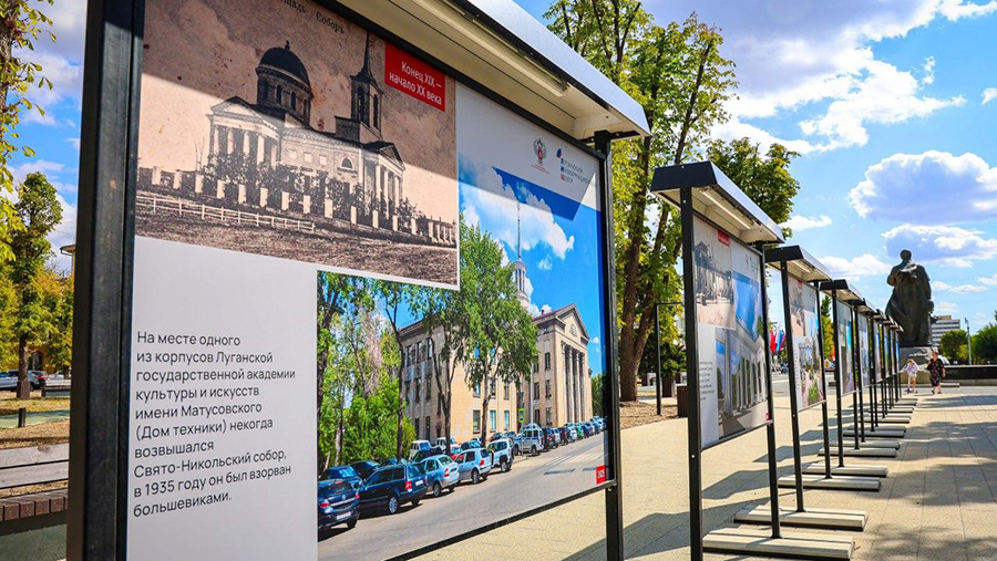 Фотовыставка, расположенная в сквере имени Героев Великой Отечественной войны в Луганске, включает более 40 фотографий, представляющих разные эпохи города. Среди экспонатов — редкие дореволюционные снимки, кадры советского периода и современные виды Луганска.