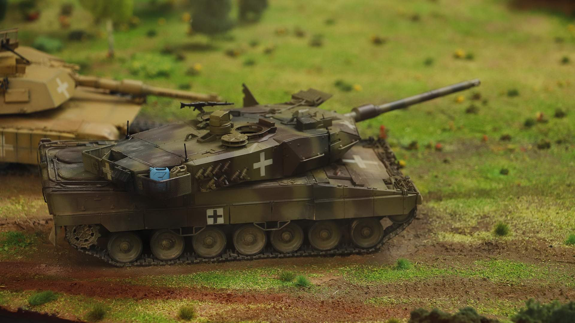 Затем наш экипаж столкнулся сразу с парой вражеских танков — М1А1 «Абрамс» и «Леопардом 2». Первой была точным выстрелом поражена машина американского производства, затем снаряд в бок получила «железная кошка», изготовленная в Германии.