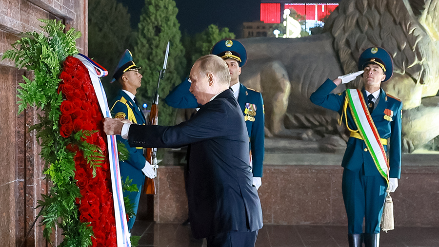 На опубликованных кадрах видно, как российский лидер возложил букет красных роз к памятнику Сомони в центре таджикской столицы.