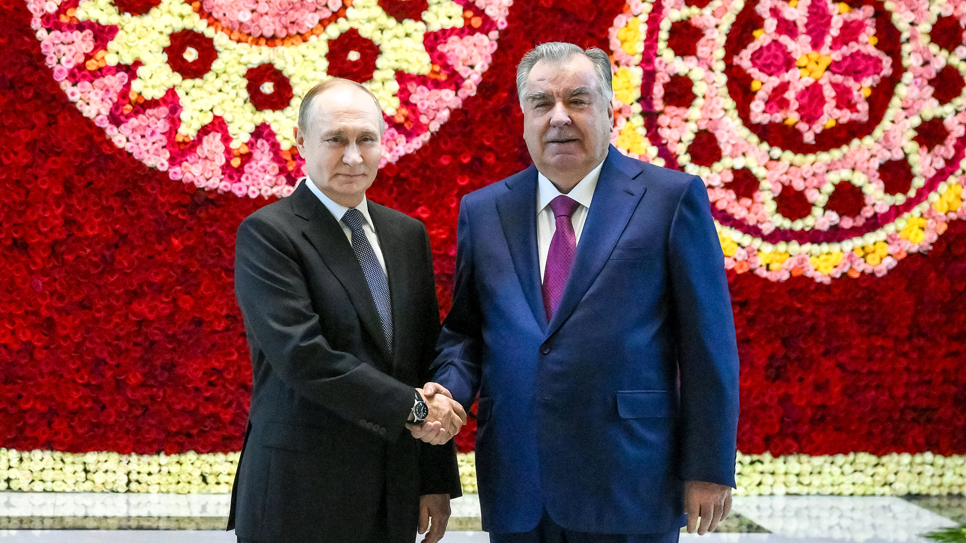 У трапа самолета Владимира Путина ожидал лично президент Таджикистана Эмомали Рахмон. Их общение состоялось «на ногах», в ярком интерьере — на красной ковровой дорожке, с двух сторон обрамленной цветами. На здание аэропорта в этот момент проецировались кадры со встреч двух лидеров государств.