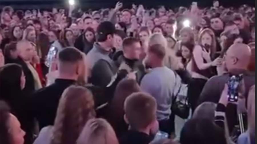 На кадрах видно, как ожидающая начала выступления певицы толпа людей начала потасовку в концертном зале.