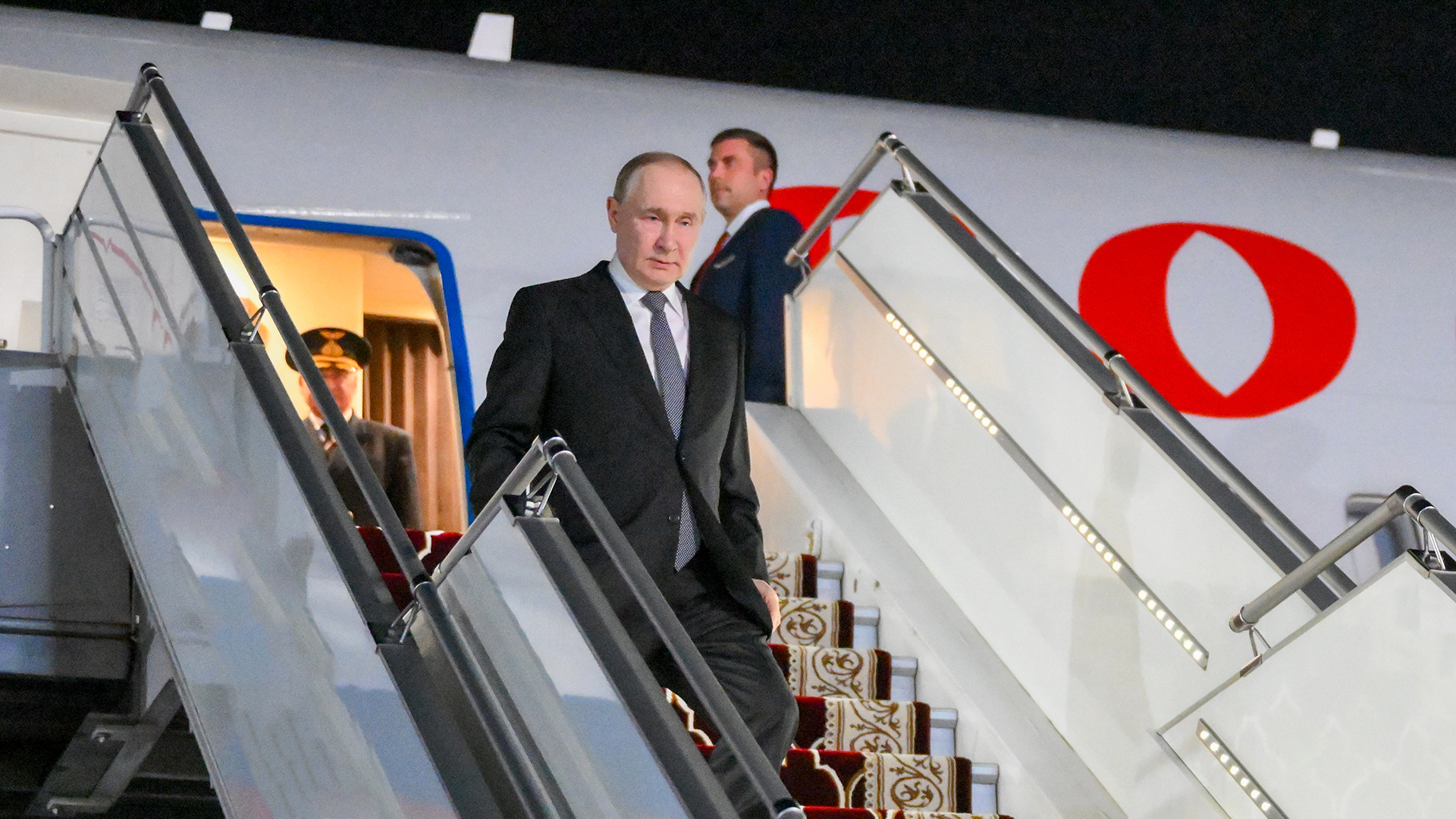 В аэропорту Манас была проведена торжественная встреча: подняты флаги государства и организован почетный караул. У трапа «борта номер один» российского президента встретил лично глава Киргизии Садыр Жапаров.