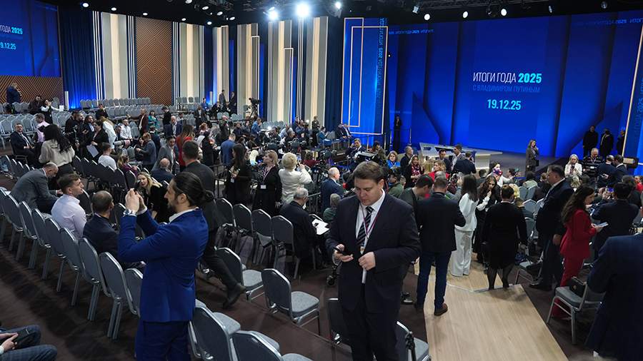 В зале в Гостином Дворе в Москве, где скоро начнется программа «Итоги года с Владимиром Путиным», уже собралось множество журналистов, в том числе из недружественных России стран. Обстановку в зале 19 декабря показали «Известия».