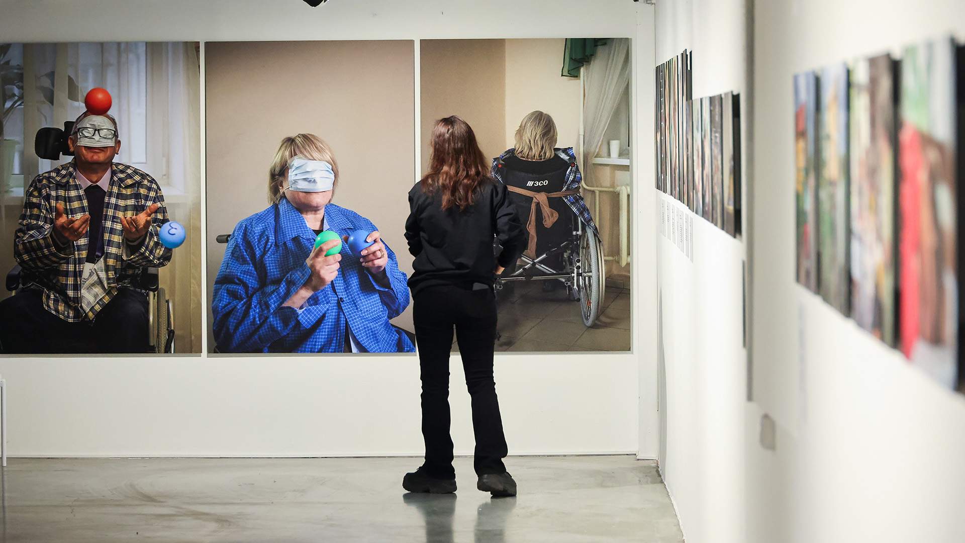 У выставки есть и светлая секция: как может быть устроена жизнь людей, которые попали в психоневрологические интернаты. Там на фотографиях гораздо больше улыбок, с людьми рядом находятся волонтеры, даже одежда — другая. Это зал, где показаны положительные изменения в ПНИ.