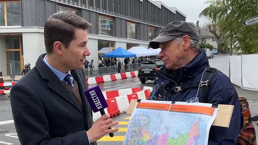 Житель Женевы Мартин вышел 18 февраля на одиночный пикет во время переговоров по украинскому урегулированию. В разговоре с корреспондентом «Известий» Игорем Балдиным мужчина пояснил, что карта связана с его давней поездкой в Россию.