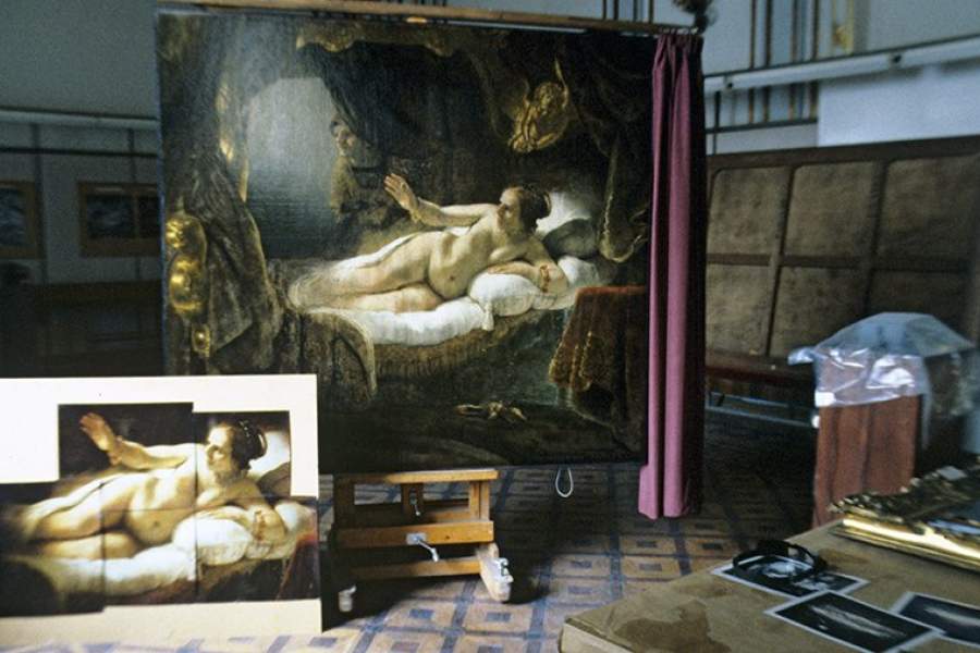 15 июня 1985 года во время экскурсии в «Эрмитаже» 48-летний литовец Бронюс Майгис облил серной кислотой и порезал ножом картину кисти Рембрандта «Даная». Ее реставрация заняла 12 лет. На снимке — картина в реставрационной мастерской Государственного Эрмитажа