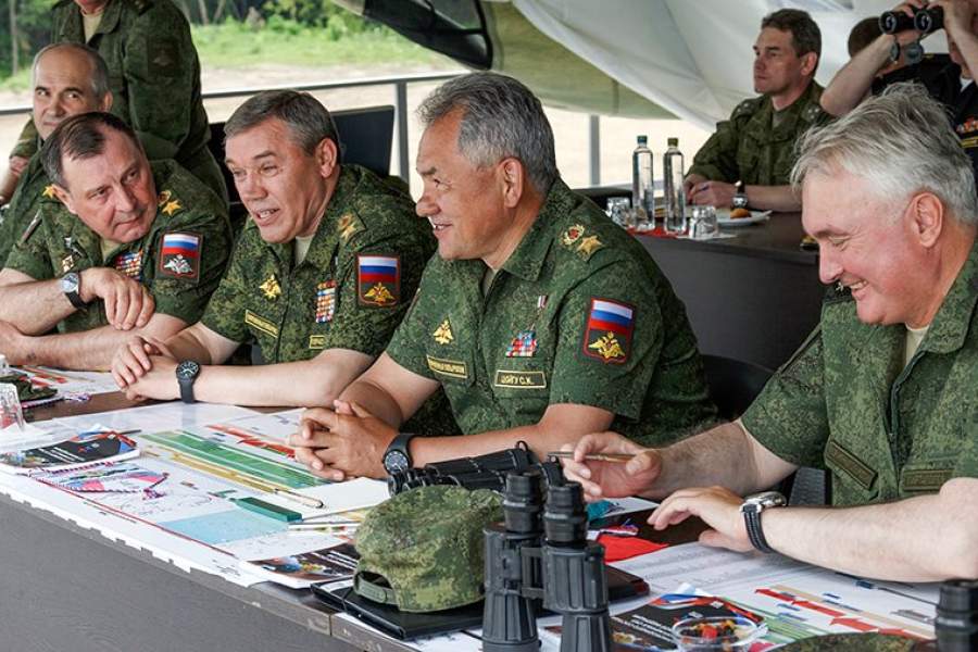 Начальник Главного оперативного управления Генштаба ВС РФ Сергей Рудской, заместитель министра обороны РФ Дмитрий Булгаков, начальник Генерального штаба Вооруженных сил РФ – первый заместитель министра обороны РФ Валерий Герасимов, министр обороны России Сергей Шойгу и командующий войсками Западного военного округа Андрей Картаполов наблюдают за учениями