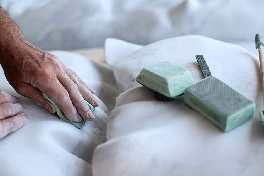 Работник очищает мраморную скульптуру на заводе в Тоскане