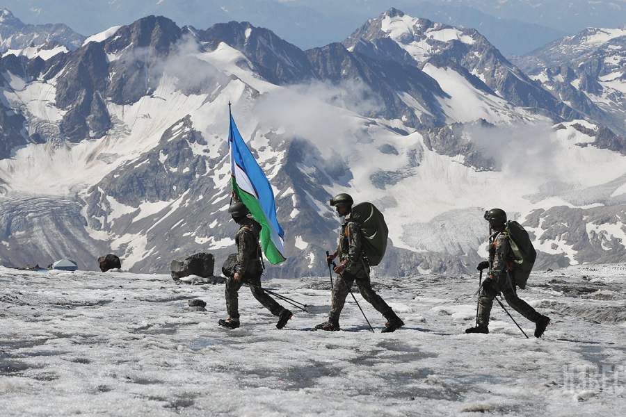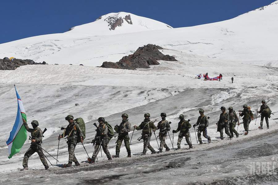 Состязания проводились в три этапа: первый — в центре горной подготовки «Терскол», второй — марш в горной местности вокруг горы Эльбрус протяженностью 100 км, третий — восхождение на западную вершину Эльбруса (5642 м). На фото: команда армии Узбекистана