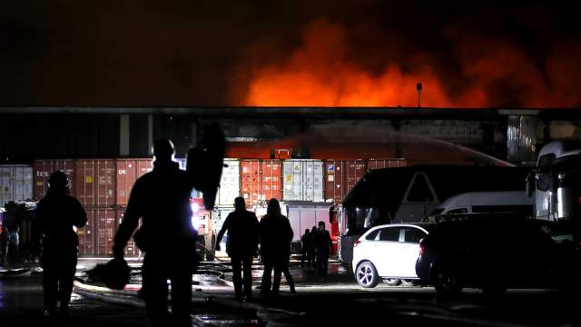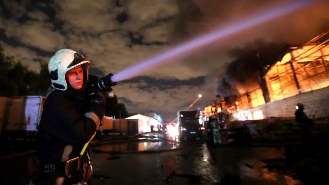 Начальник ГУ МЧС по Москве Илья Денисов сообщил, что имеется угроза обрушения несущих стен на горящем складе в Москве.